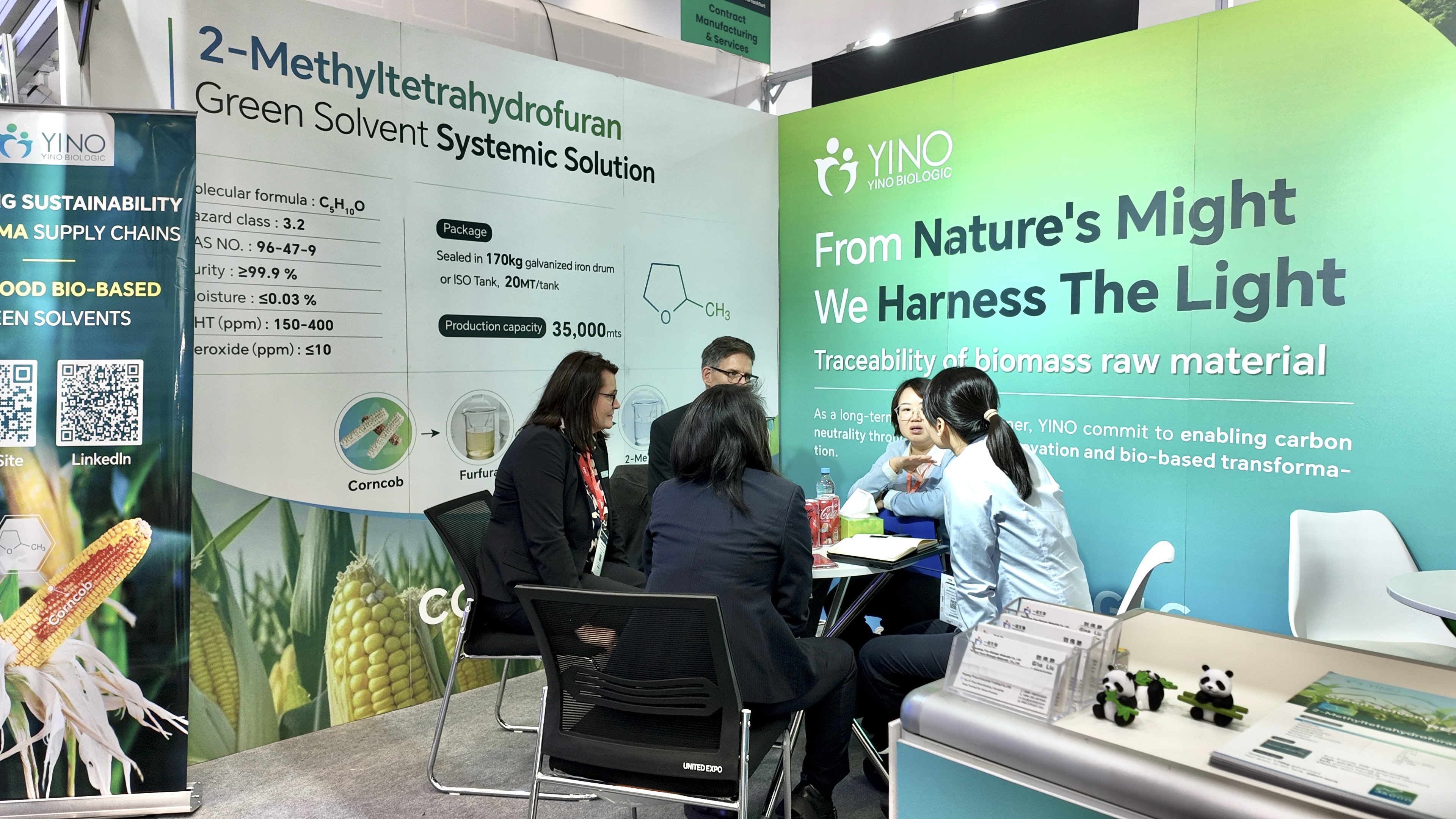 在制藥生產(chǎn)中,溶劑與原料的選擇不僅關(guān)系到工藝的安全性與環(huán)境友好性,更直接影響藥物純度和生產(chǎn)效率。YINO Biologic 以非糧生物質(zhì)玉米芯為原料,從源頭實現(xiàn)碳減排與資源高效利用,構(gòu)建了覆蓋從原料到終端制造的綠色供應(yīng)鏈。本次展會上,公司重點展示了多款高性能可持續(xù)產(chǎn)品,包括可作為活性藥物成分(API)合成綠色溶劑的 2-Methyltetrahydrofuran(2-MeTHF),該產(chǎn)品可有效替代傳統(tǒng) THF,顯著降低揮發(fā)性有機物排放并提升反應(yīng)安全性與效率;用于高端藥物保護基及精細化工中間體合成的關(guān)鍵原料 3,4-Dihydro-2H-Pyran(DHP);以及新一代高純度環(huán)狀酯原料 δ-Valerolactone(δ-VL),廣泛應(yīng)用于藥物輔料及聚合物開發(fā)領(lǐng)域,充分展現(xiàn)了 YINO 在綠色化學與可持續(xù)材料創(chuàng)新方面的實力。
